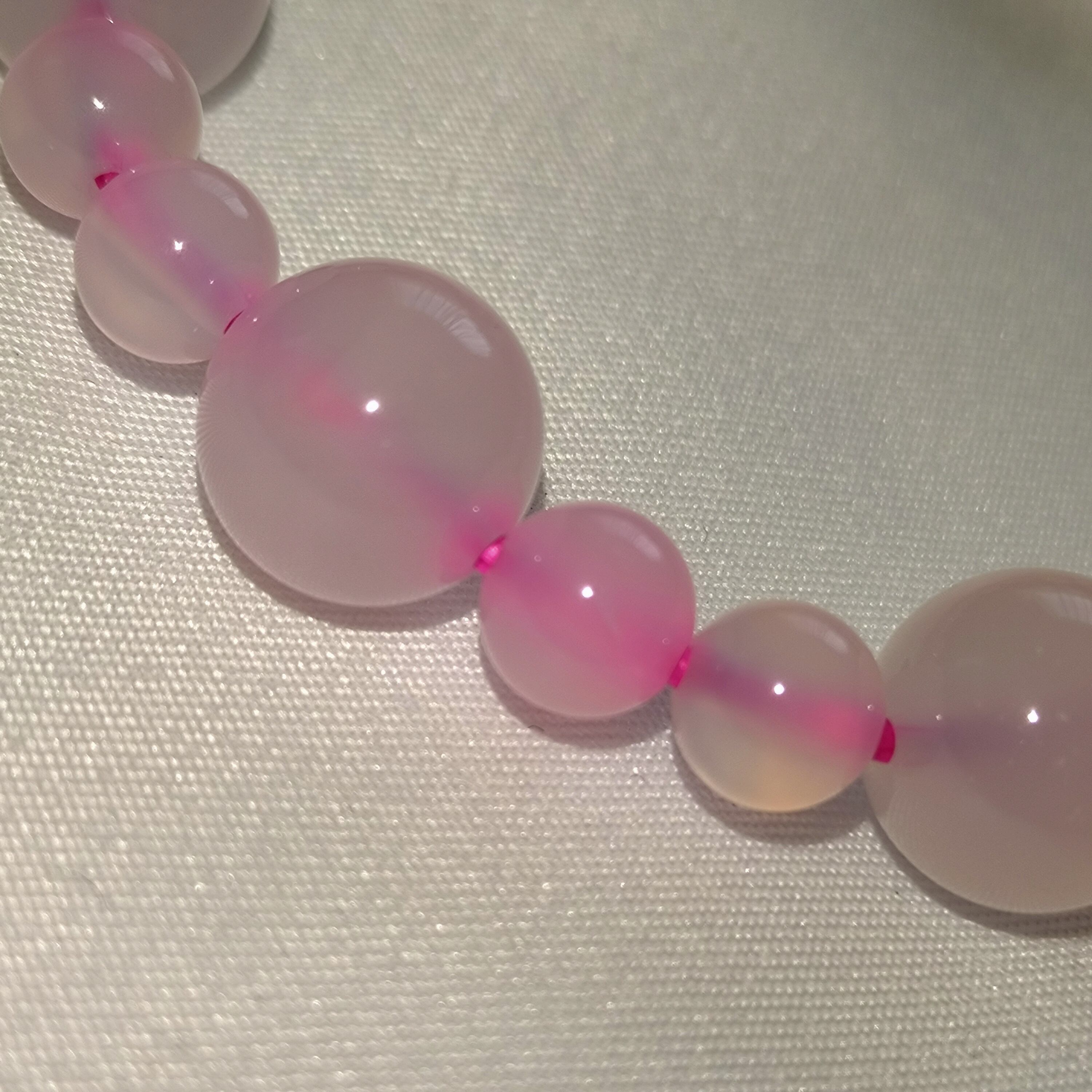 大小のラウンドビーズがリズミカルに並び、手元をふんわりと包み込むような優しい印象に。