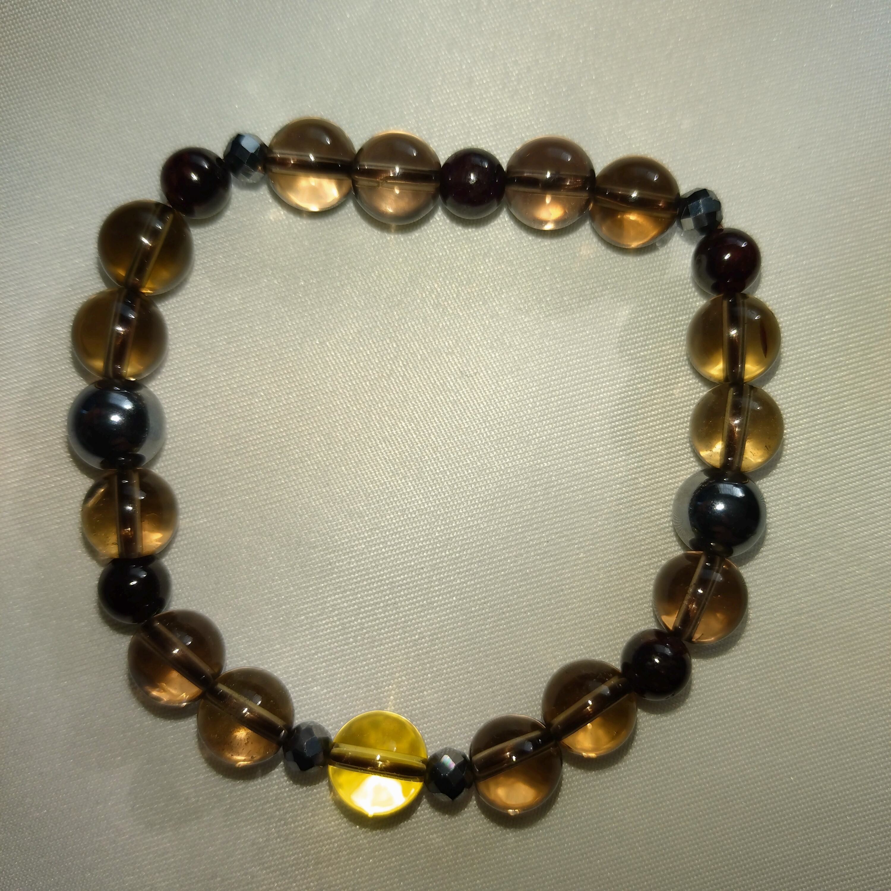 落ち着いたブラウンカラーを基調に、テラヘルツ鉱石とガーネット風の赤玉、イエローカルサイト風の透明感ある黄色玉をバランスよく組み合わせた、高級感ある天然石ブレスレットです。