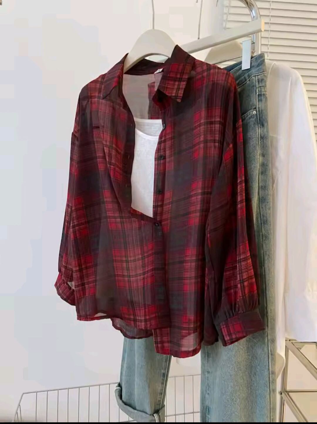 春夏のお出かけにぴったりの、軽やかなシアー素材のチェック柄シャツ。